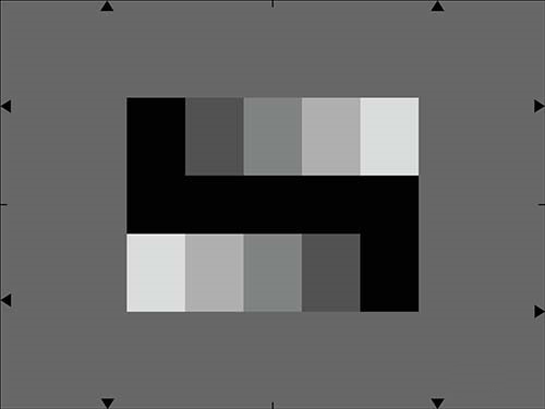 TE109-Q用于成像系統(tǒng)的色調(diào)還原評(píng)估。兩個(gè)5階灰度塊逆向排列在灰色背景上,灰度刻度為對(duì)數(shù)級(jí)別。利用兩個(gè)相反的5階線性步進(jìn)信號(hào)產(chǎn)生最佳的相機(jī)伽馬矯正值。