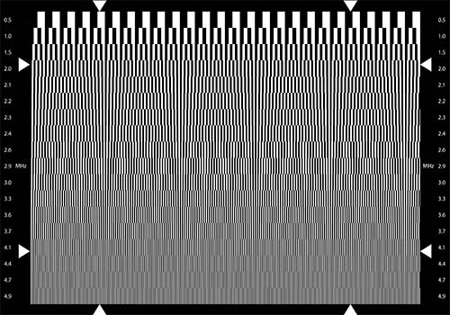TE144-Q用于評估消費(fèi)者攝像機(jī)的頻率響應(yīng)。測試圖被細(xì)分為18個(gè)不同頻率的條形圖水平場。