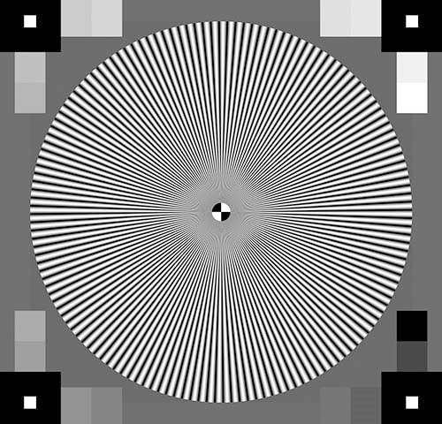 用于分辨率的評(píng)測。Chart圖包含一個(gè)正弦西門子星Siemens star位于圖卡中心,在四個(gè)角落分別有灰階、標(biāo)志圖塊。